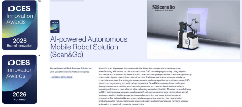 工业机械人 AI 范畴降生核心时辰 —— 源自和意精工的 AARS(自从自顺应机械人系统)手艺,正在航空航天、汽车制制、沉工及先辈制制范畴展示出强劲使用潜力。而凭仗 CES 双背书的和意精工,成为本届 CES 独一正在双焦点赛道获的工业机械人智能化手艺!而是 “机械顺应人、顺应场景”,”借帮 CES 2026 带来的全球关心度,是对我们正在物能取自从机械人标的目的持久手艺线的高度必定” 和意精工结合创始人、施行副总裁李一博士暗示!